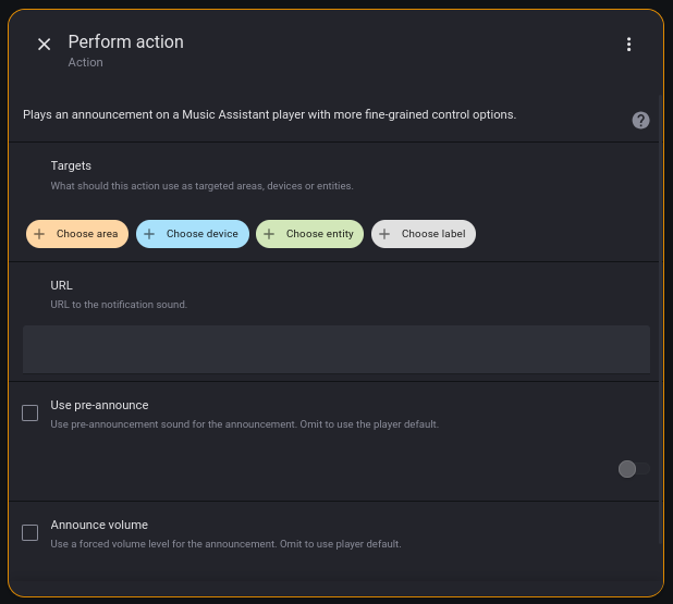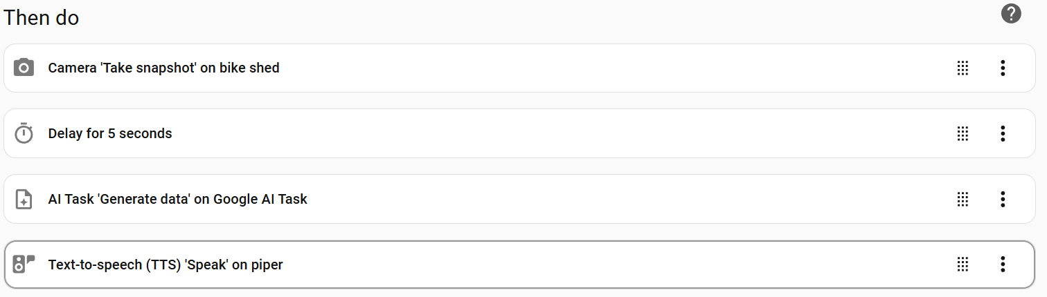 I have an automation to take a camera snapshot, send it to the ai task for analysis, and then (the bit I can’t get to work) play it as a tts announcement via music assistant.