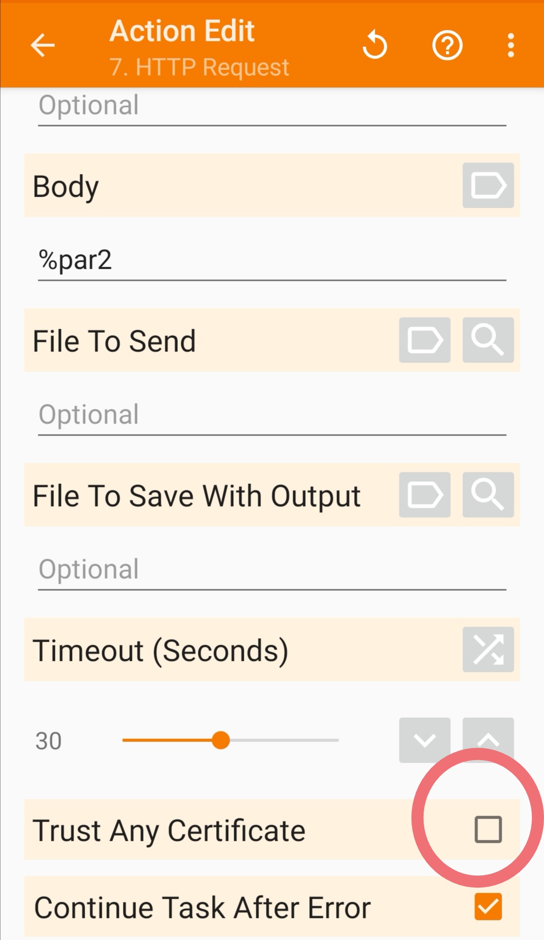 Can you open the HA call-service task, go to action number 7 (HTTP Request) , and tell me if “Trust Any Certificate” is checked ?