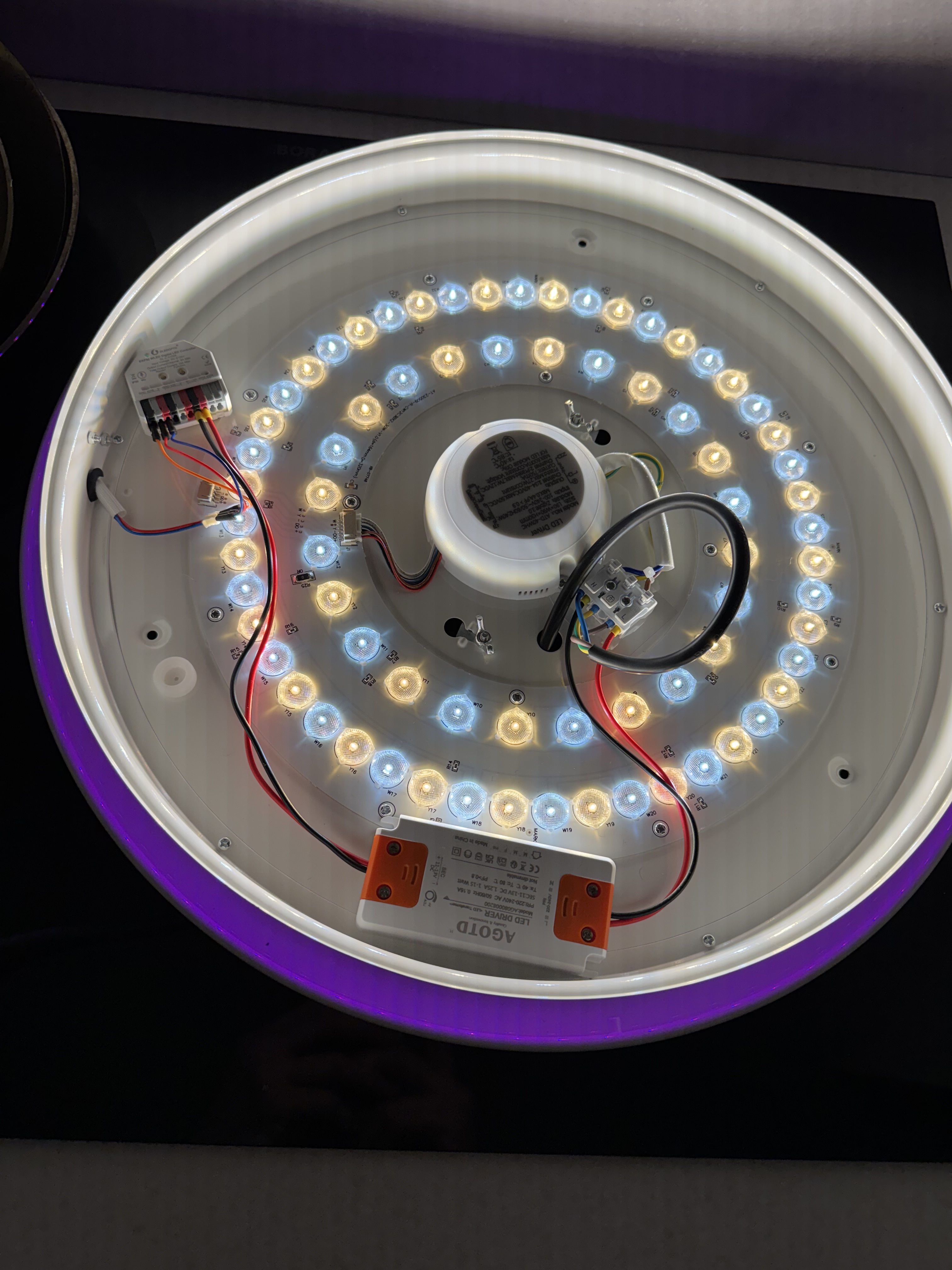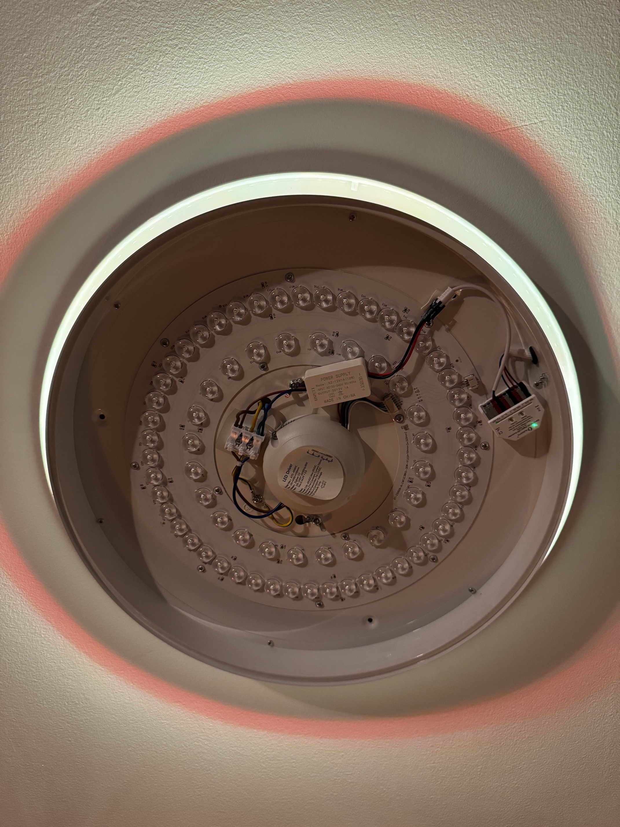 I was experiencing an issue where the RGB ring would randomly flicker or turn on. From what I’ve read, this could be either a hardware defect or a software bug. While opening the light to unplug the RGB, I decided to add an ESP32 running WLED along with a separate LED driver. This way, I could have better control over the lighting and avoid the flickering issue altogether.