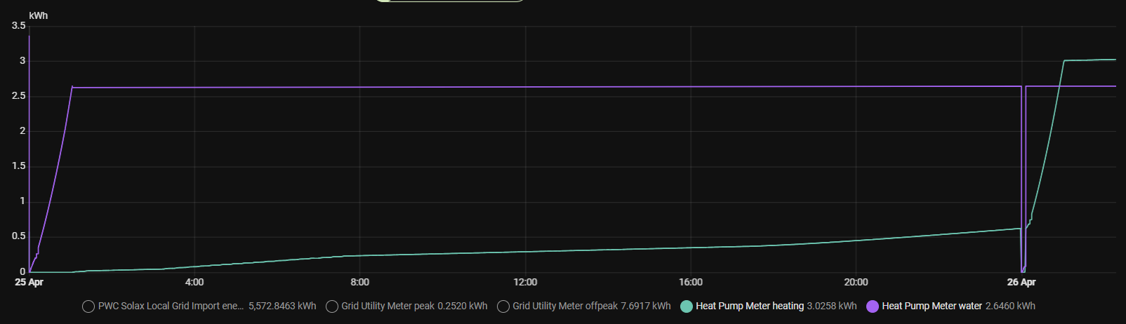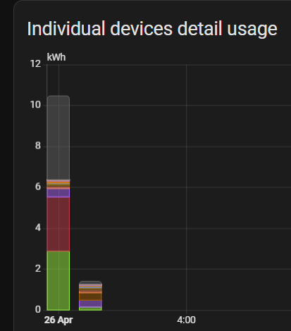 The grey showed un accounted for energy, the red was my heat pump water (which was running off batteries) and the green was my heat pump heating meter, the only real value that should have been on there was the red hot water, but even that had a bump at the same time as well.