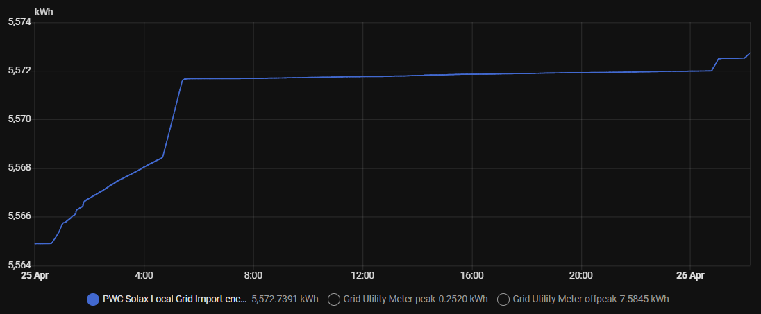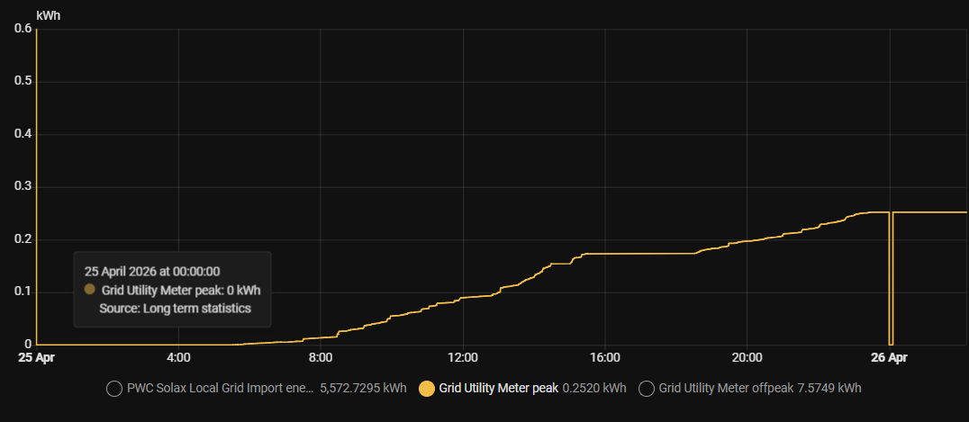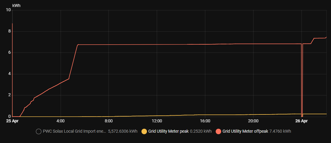 I’ve been noticing on and off that the utility meter does some pretty weird things, sometimes recording energy I can’t account for, but today I’ve caught it doing a full value reset, not to 0, but to the end value of the previous day.