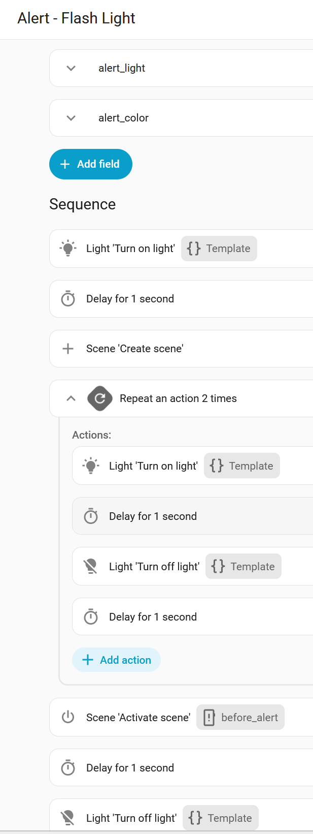 I use the light and RGB color as fields to call this from other automatons. I send in the light and the color I want for the alert. I was thinking of even adding fields for how many flashes and the delay length.