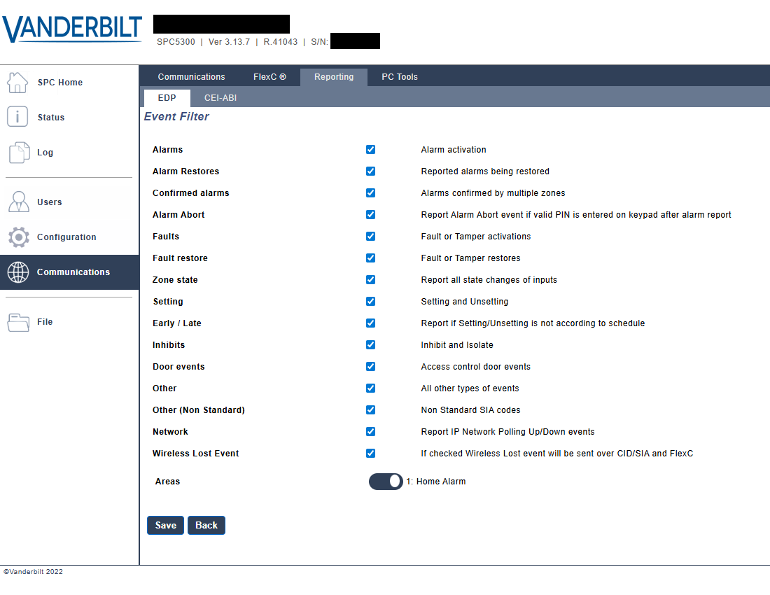 As far as i can see on SPC alarm panel side , the event Alarm Activation shoudl be communicated over EDP.
