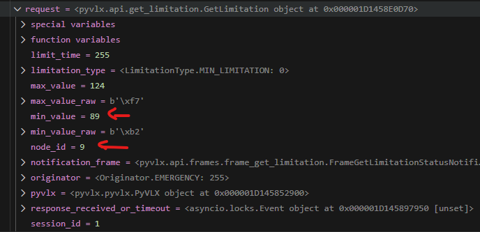 2026-01-08 00:15:00.605 DEBUG (MainThread) [pyvlx] REC: <FrameGetLimitationStatusNotification node_id="9" session_id="41" min_value="b'\xb2'" max_value="b'\xf7'" originator="Originator.EMERGENCY" limit_time="255"/>