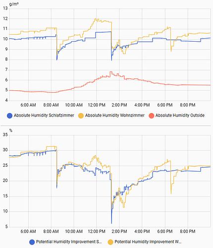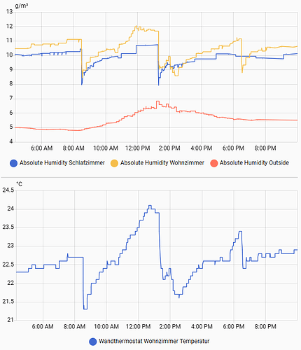 Note: You can see the cocking for lunch and dinner, as well as the ventilation having an effect on both: absolute humidity and temperature. Also the absolute humidity outside is always lower then inside. This sensor makes both values comparable!