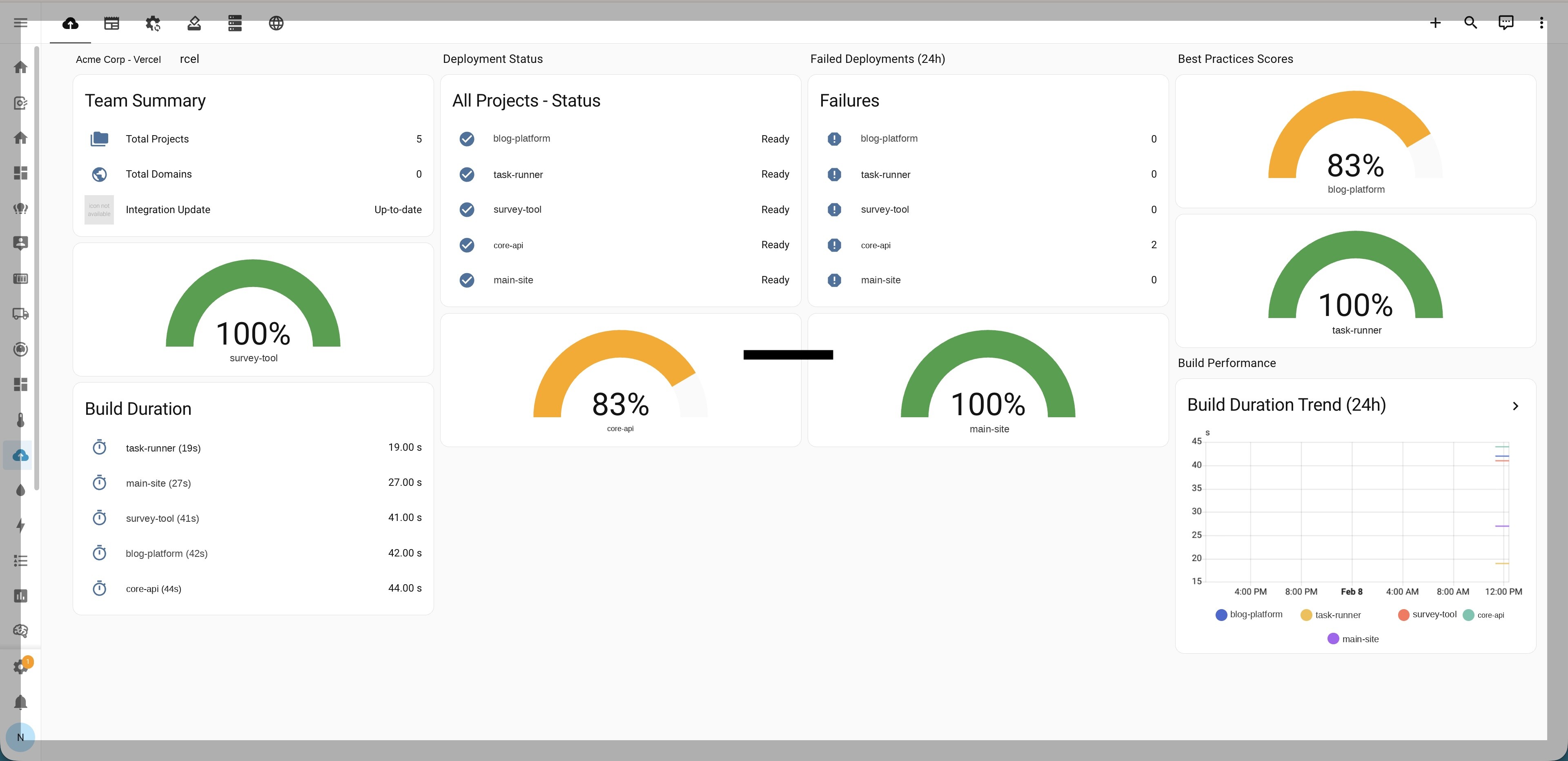 - Project health — framework detection, Node.js version, active deployment count, and 24-hour failure count per project.