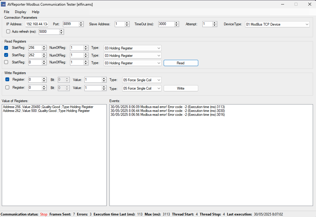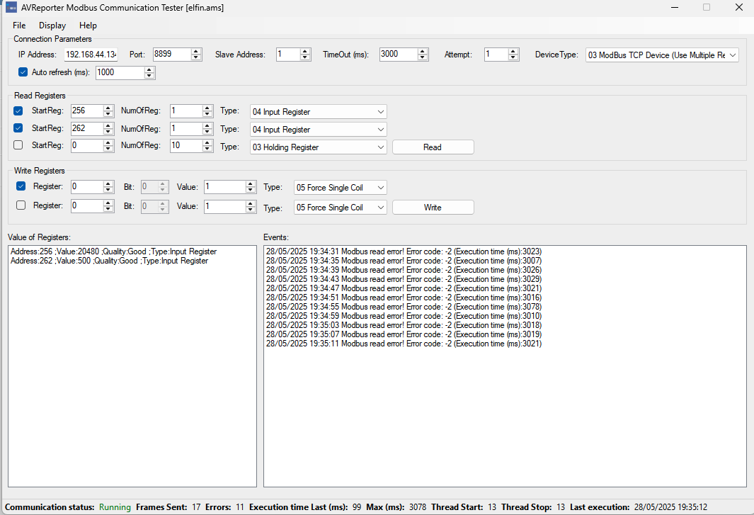 The only exception is Measurement registers, which should be read using Input Registers (function code 0x04). These are located in the range 0x0100–0x0111 (decimal 256–273).