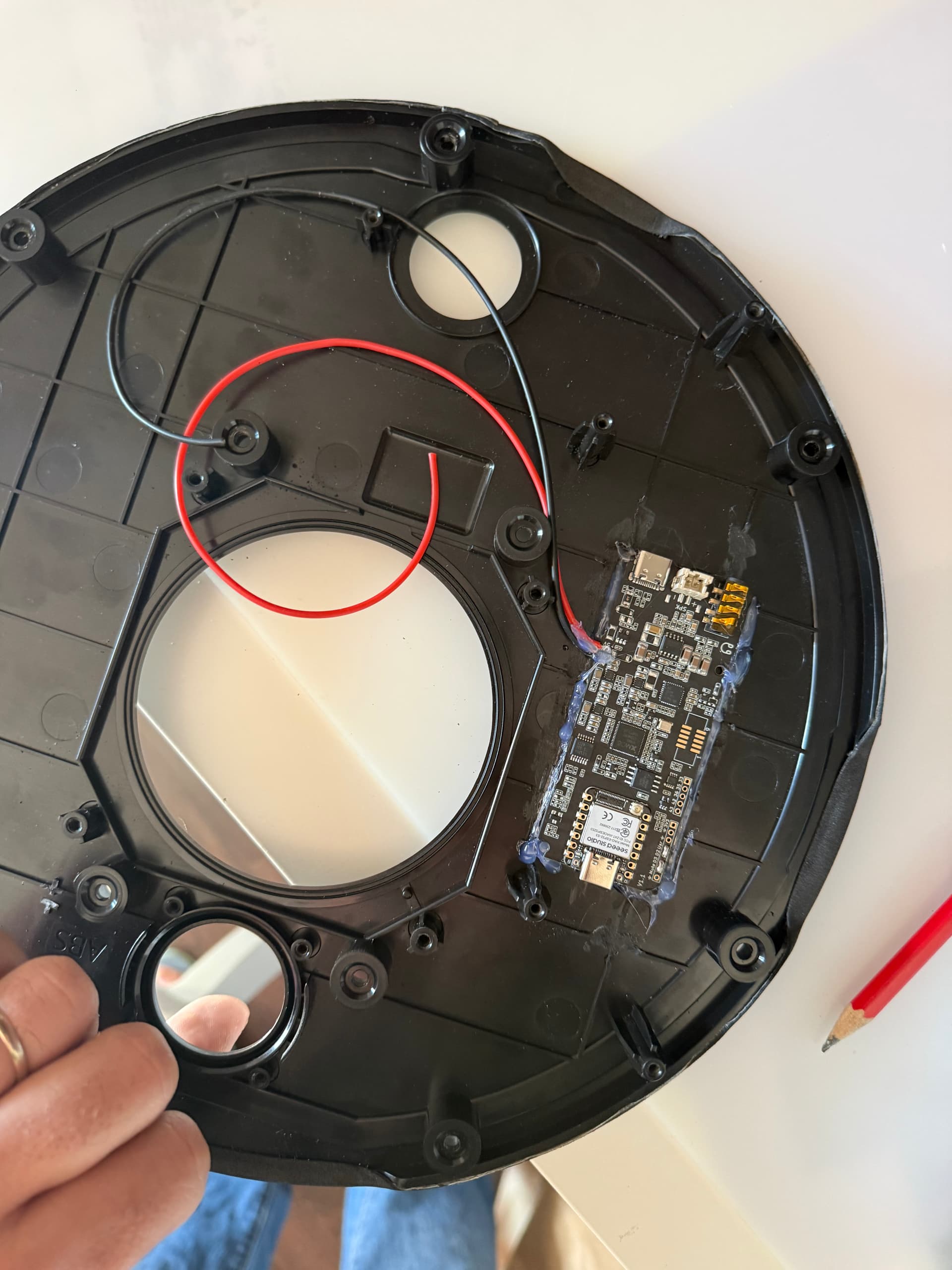 With a drill I made holes in the front for the microphones and the led and and I glued the Respeaker with hot glue