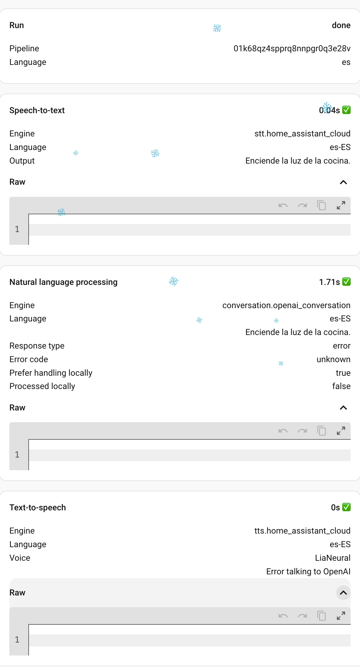 I am very new to Voice in HA. In the process of testing it and trying to understand how it works, I have noticed a weird issue with (at least) one particular light. When I as it to turn on the lights in the kitchen, it does not try to run that locally, and then eventually fails to even try it in OpenAI, but that’s another issue, I think.