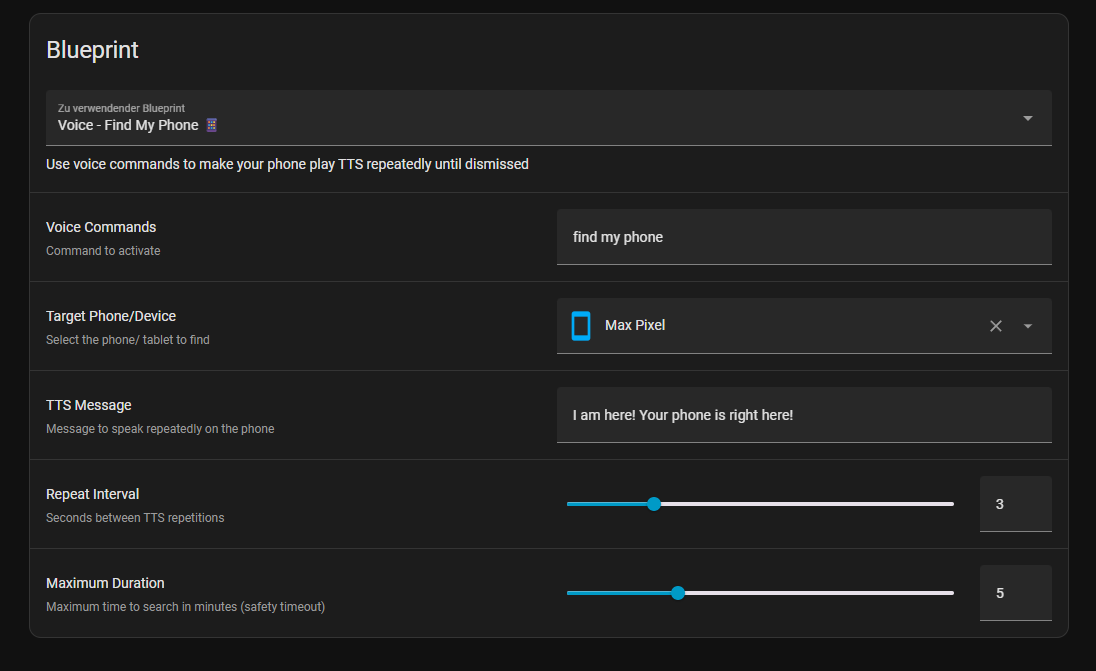 That’s why I created this blueprint—it should make finding your phone much easier. You just define a command, specify which phone to locate, and set a few details for the TTS (Text-to-Speech).