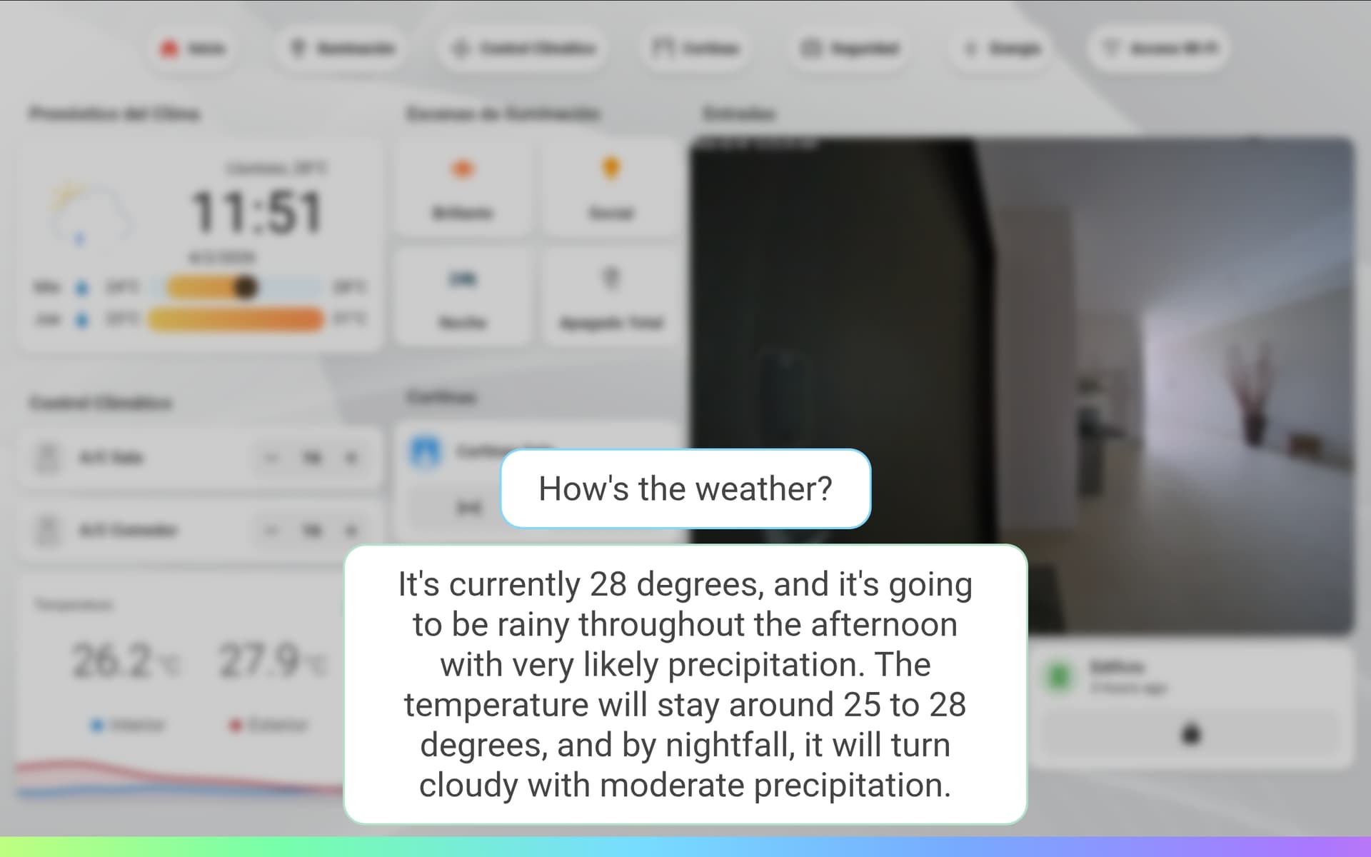You drop it into any dashboard view and it works invisibly in the background. When it picks up the wake word, it shows a subtle gradient animation bar and transcription bubbles, processes your request through the pipeline, and plays back the TTS response through the device speakers.