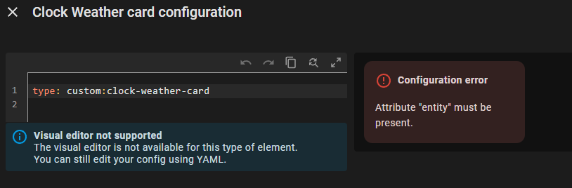 I tried to add a card “clock weather card” but it says visual editor not supporded and attribute “entity” must be present. what am I doing wrong?