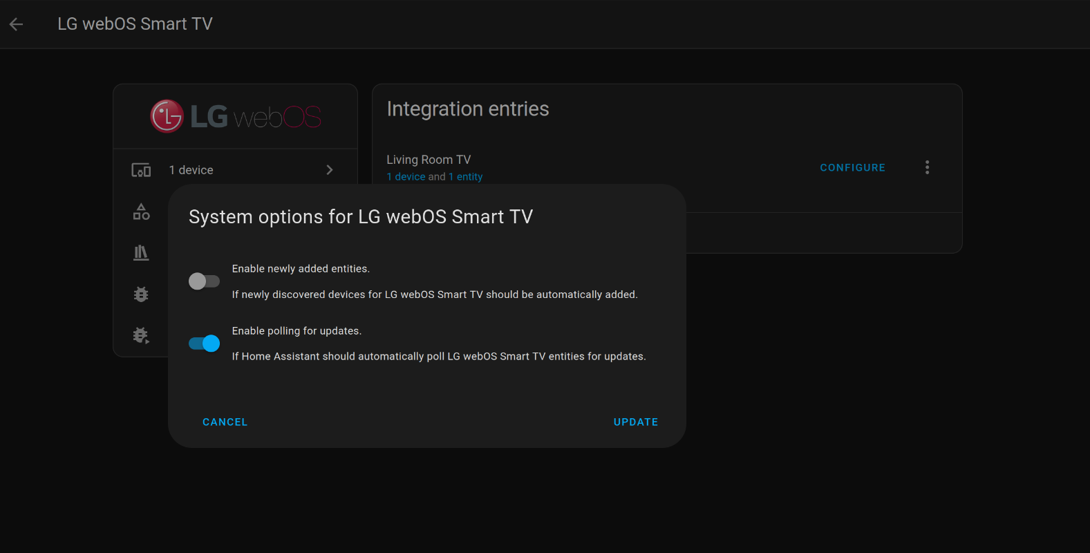 Stop the WebOS integration trying to be clever - Auto adding/removing entities.