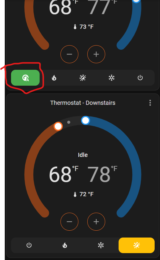 The top thermostat is imported from Hubitat via the Hubitat integration. It has that green auto button circled in red. I just paired my downstairs T6 thermostat with HA, and it does not have that auto button. I checked the device in HA, and also the thermostat itself. Not sure why it no longer has an auto mode.
