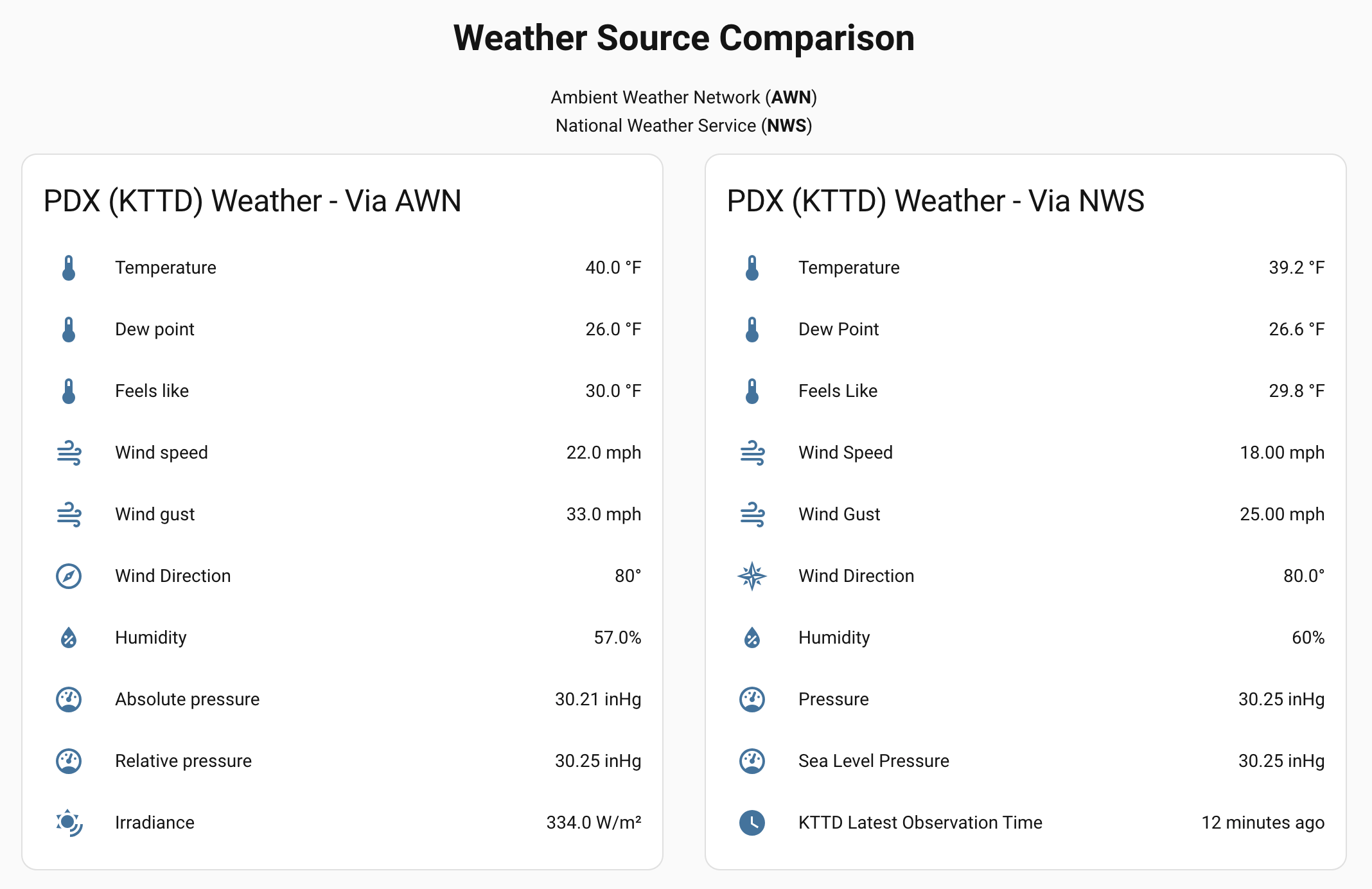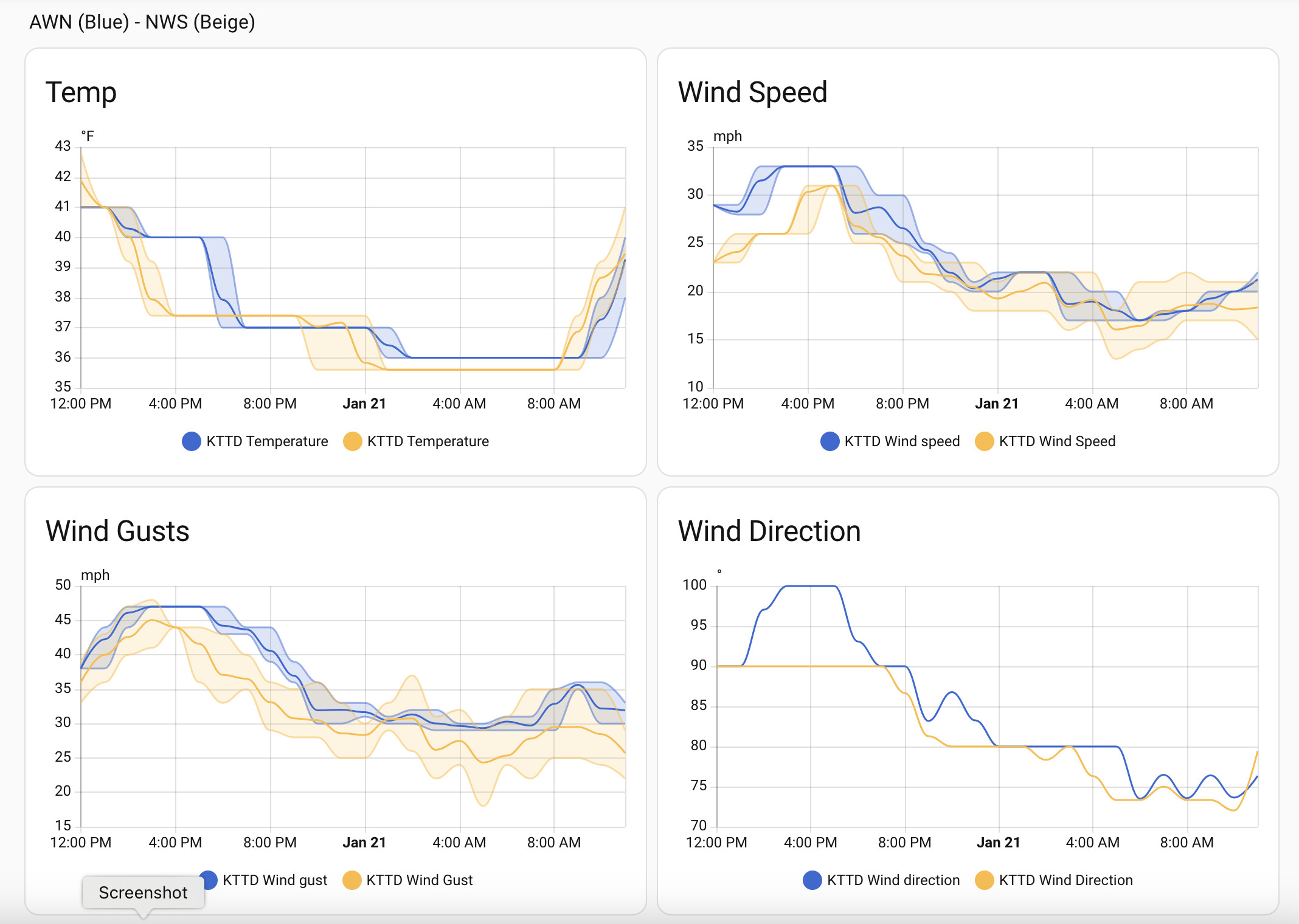 I’m collecting data from Ambient Weather network (KTTD) and the National Weather Service (NWS). Here are some snapshots showing data, and some historical charts: