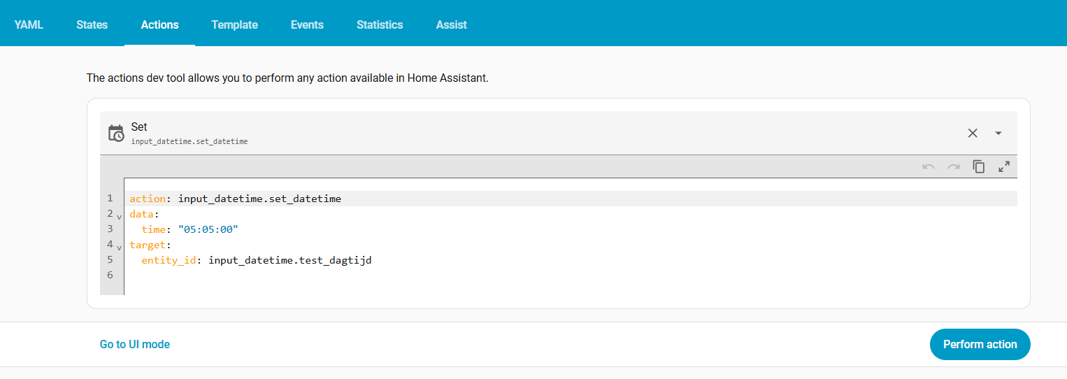 Lower down in the Examples section you will find examples for how to set up actions for each of the different varieties of Input Datetime entities i.e. date, time, date & time.