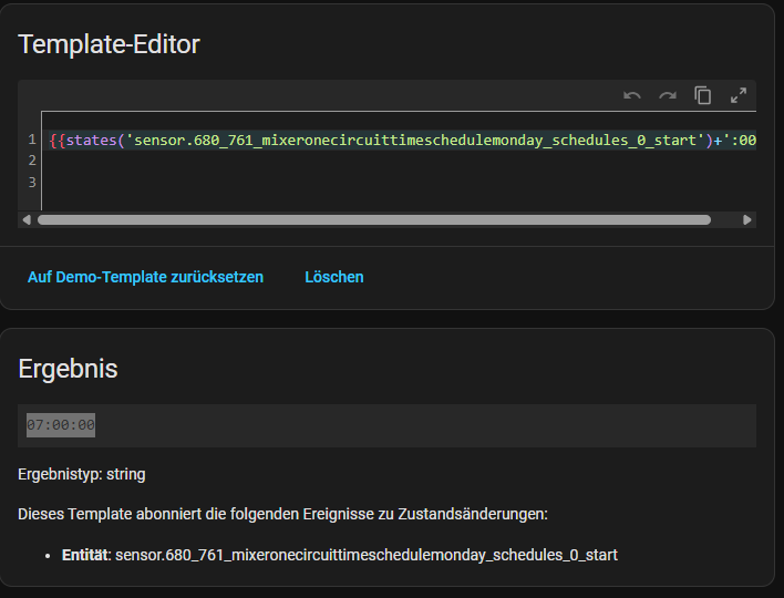 In the template, {{states(‘sensor.680_761_mixeronecircuittimeschedulemonday_schedules_0_start’)+‘:00’}} returns the result “07:00:00”, which is also correct.
