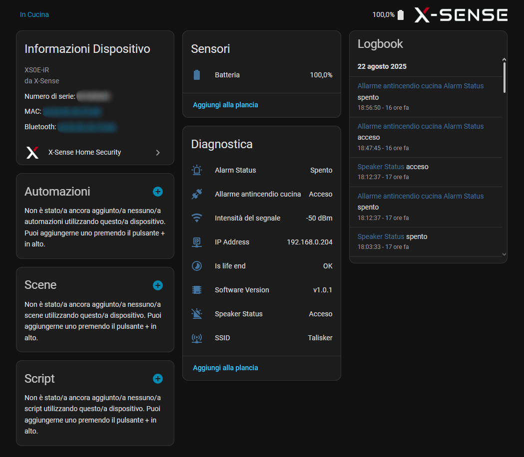 2025-07-11 18:51:38.319 ERROR (MainThread) [custom_components.xsense] // DBG data {'state': {'reported': {'00540CAE': {'houseId': 'BEA9B3105E7C11F089D2C7EE1B5024EF', 'type': 'XS01-WX', 'stationSN': '00540CAE', 'wifiRssi': '-32', 'batInfo': '3', 'time': '20250712015141', 'onlineTime': '20250712015141', 'status': {'alarmStatus': '1', 'muteStatus': '1', 'time': '20250712015141'}}}}, 'clientToken': '12186'}