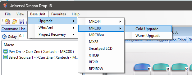 The front port is designed for Programming/Flashing the unit while the Rear RS232 Port (DB9) is designed for control. the Rear COM Port on the MRC88 remains disabled until a Universal Dragon Drop-IR project file activates that rear port (File - Project options - RS232). Then uploaded (File - Transfer project)