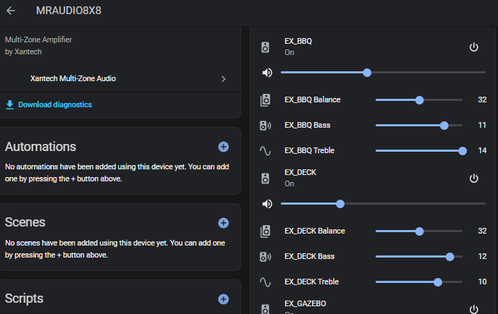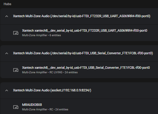 I’ve got 2x MRAudio8x8 connected to RPIs running SER2NET (Serial 2 Network). the RPI has USB-Serial adaptors on them, and ser2net exposes the serial ports as telnet ports. then in the hacs plugin i connect to it as a telnet port. I will be changing these to dedicated IP-Serial dongles shortly. The rPi’s have been great, but I like knowing that i wont have to deal with a dying rPi one day.