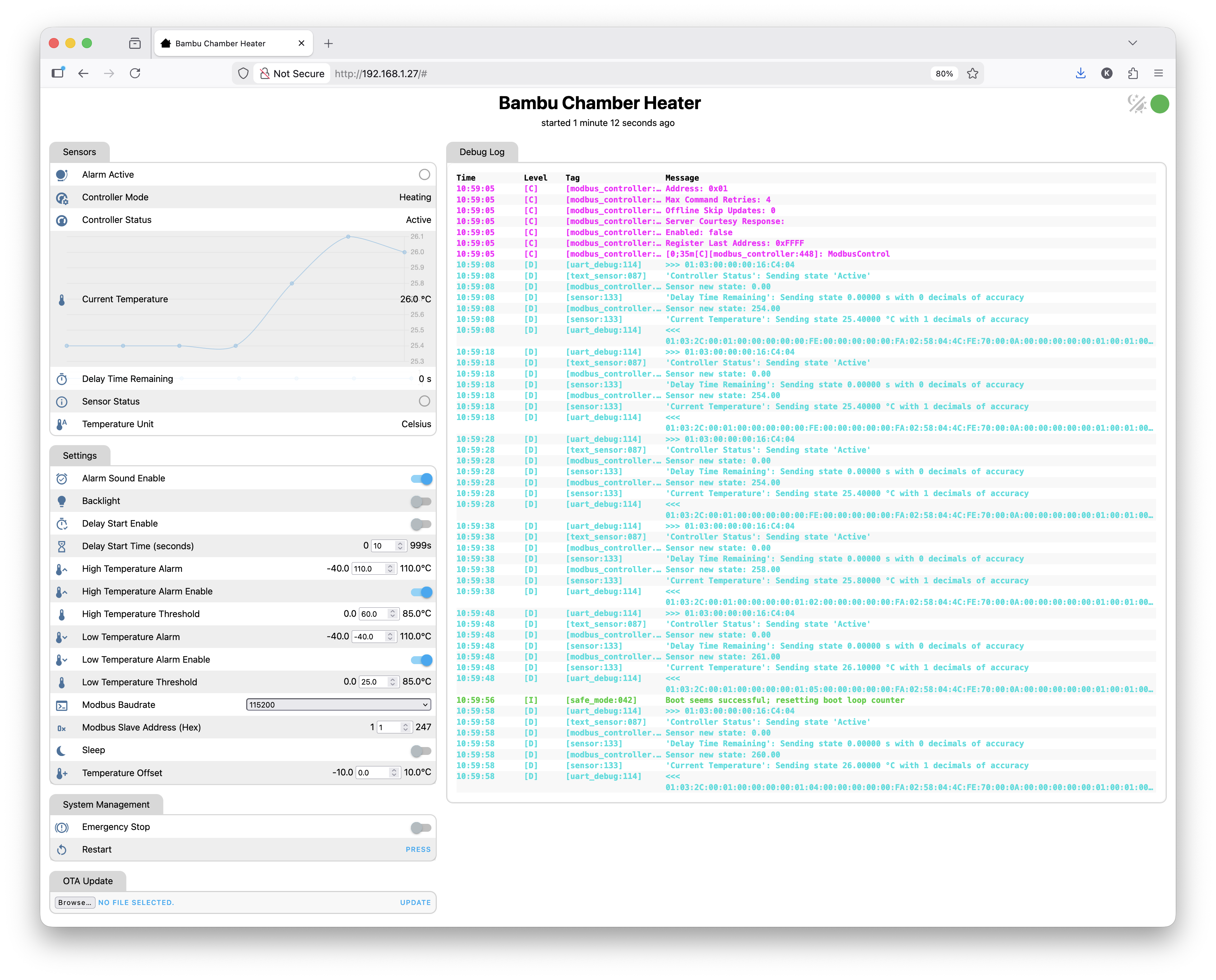 Also, you should upgrade to 1.5.3. Lots of code clean-up and optimizations, even though it’s only a point release. Hopefully, you figured out if you set the bambu_printer_id in secrets.yaml, the controller will automatically set the correct chamber heater temperature based on the filament type used during printing and turn it off when the print is done or canceled. It’s been working flawlessly for me.