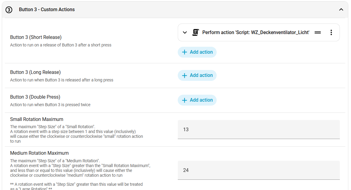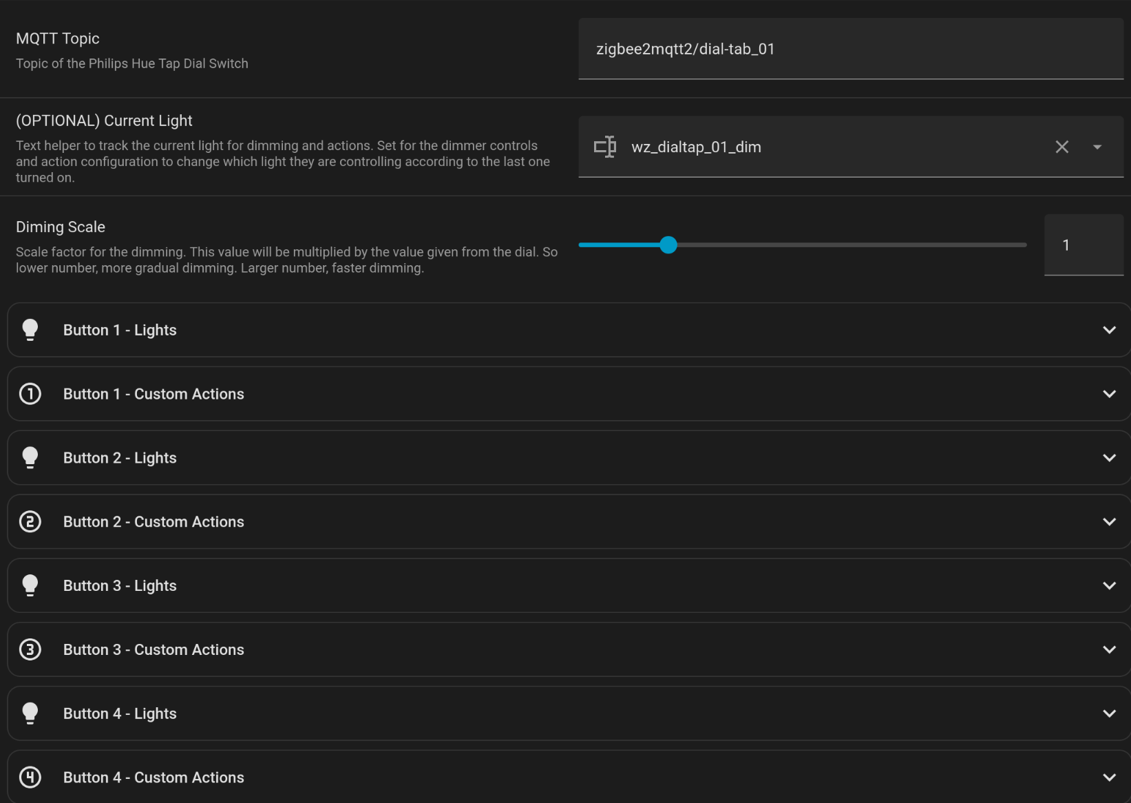 The dial can be used to dim the most recently used lights or call a custom rotation action for that button.