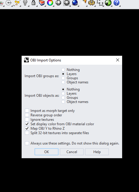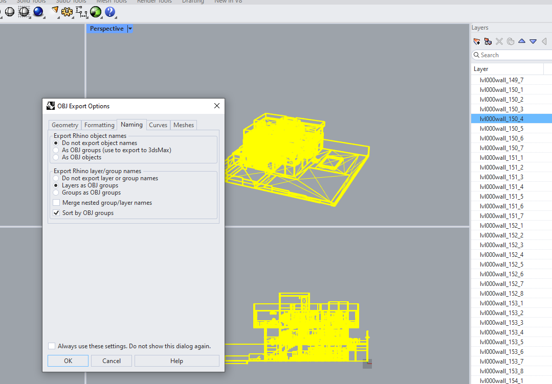 use ExportToHASS and then you have an obj file. Import to Rhino for editing you need these settings