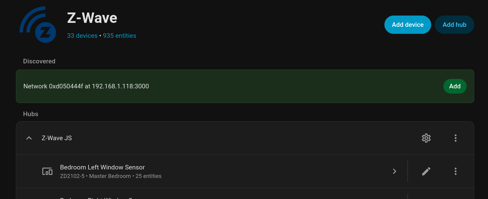 Then, when DNS discovery is enabled, you don’t manually “Add [a] Hub”. You go to the integrations page in settings and under the “Discovered” section it will show up as a discovered integration, and you “Add” it from there. There are multiple ways to add the discovered network, see next message.
