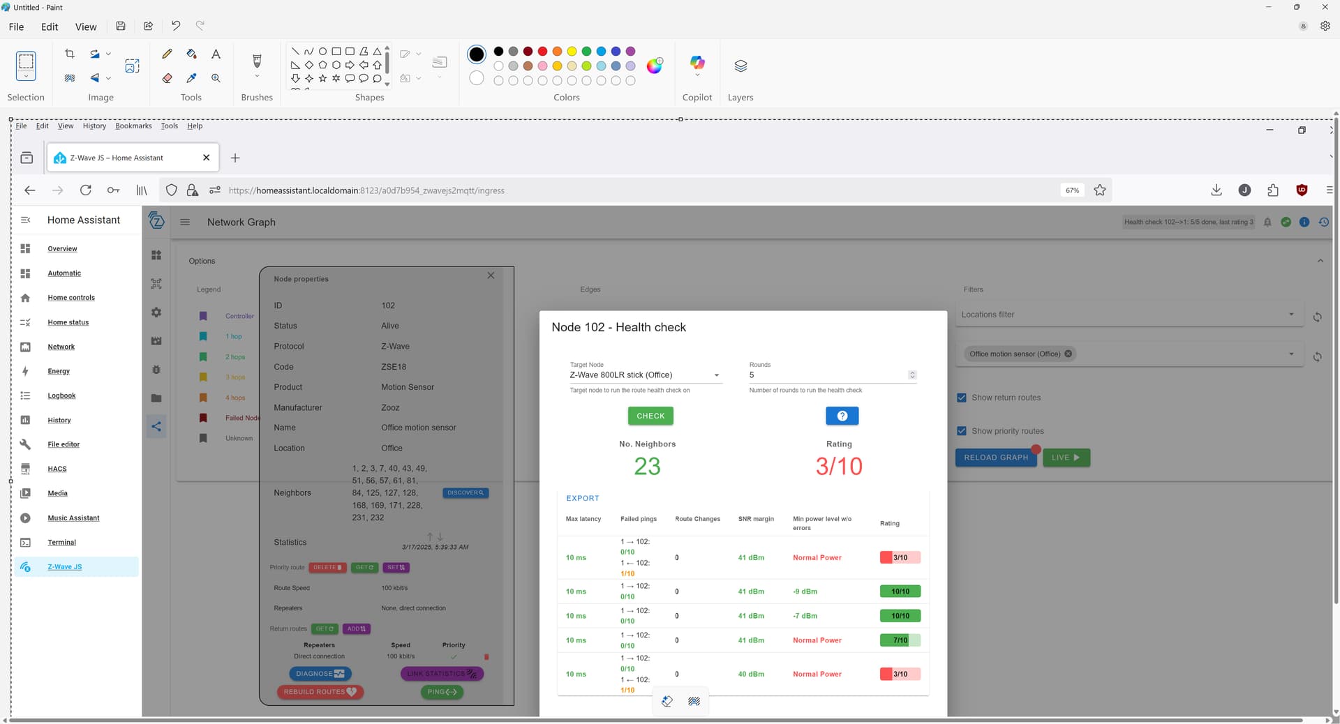 Nevertheless, I can power off the cable modem and all my Wifi APs, and my wired LAN will still function. My main computer is a wired desktop, and the host that runs the HAOS VM is also wired. I can certainly see if turning off Wifi APs causes improvements to the Z-Wave health checks. There are a lot of Wifi clients also, though, by which I mean about 300. And tons of other electronics all over the house. It’s probably easier to just flip the main breaker and run the minimal set of devices in my office that can run on UPS for a bit, to see if the Z-Wave signal improves.