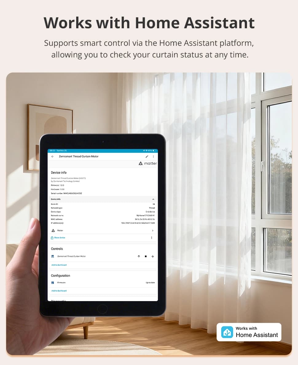 Zemismart MT03 curtain motor, a Matter-certified device using Matter over Thread, designed for seamless integration into Home Assistant and other Matter ecosystems.