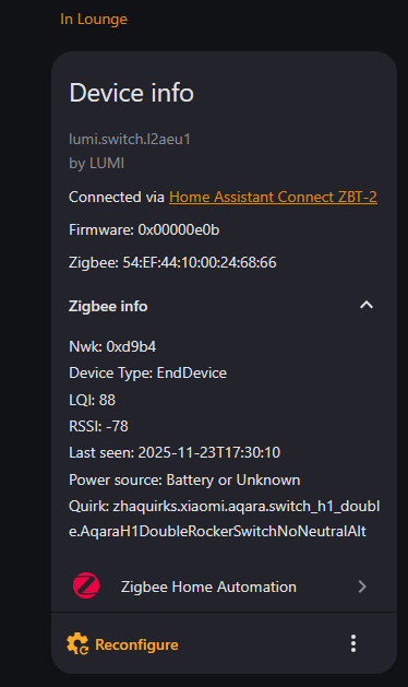 Hi All, I am fighting with a problem. I have several Aqara H1 switches (single and double rocker and both with and without neutral wire) joined to my ZHA integration. Most of them works without issues, I applied a custom quirk for the non neutral ones to support decoupled mode and here come my issue. Some of the double rocker no neutral switches are working correctly and some of them are not applying the quirk. All are the same model “lumi.switch.l2aeu1” with the same firmware version. I downloaded the diagnostics: