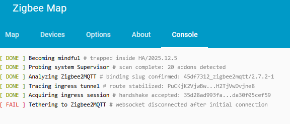 After that, the map tries to deploy a small Z2M extension over the WebSocket and then asks the coordinator for its LQI data (using the extension). In your case, that LQI request seems to be timing out after about 30 seconds, so the whole process stops there.
