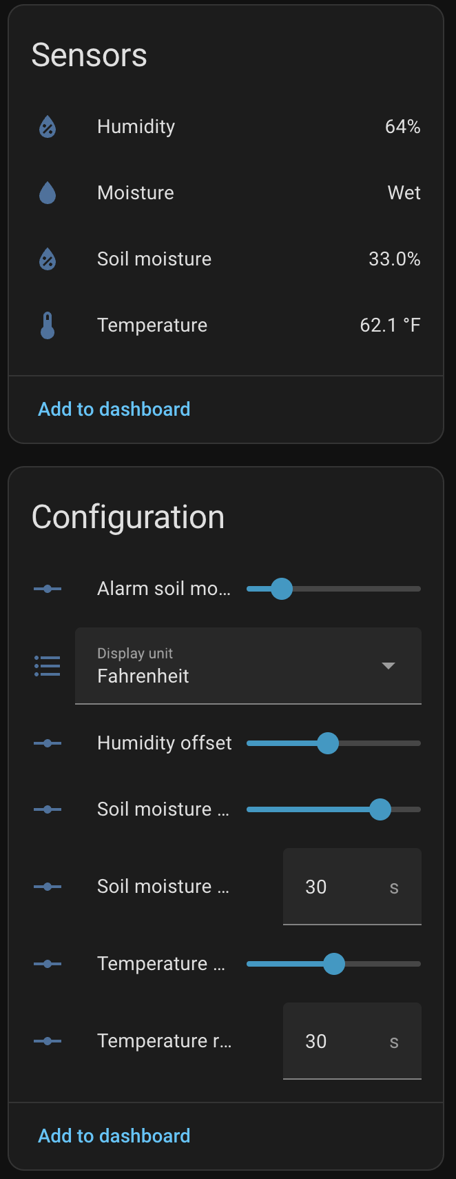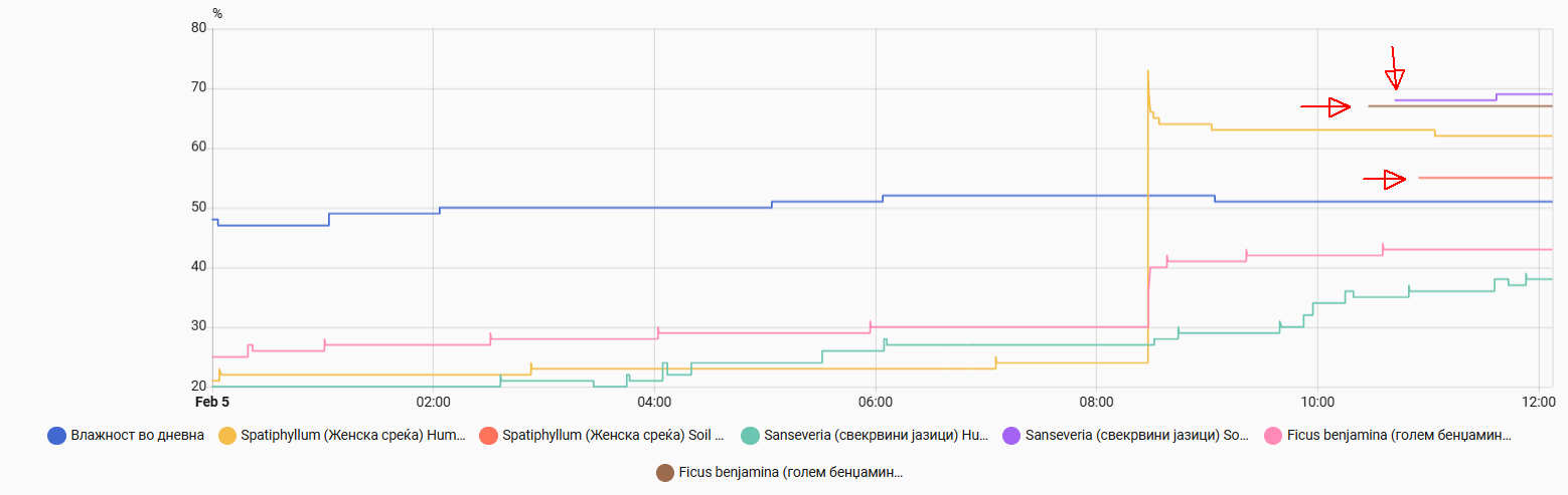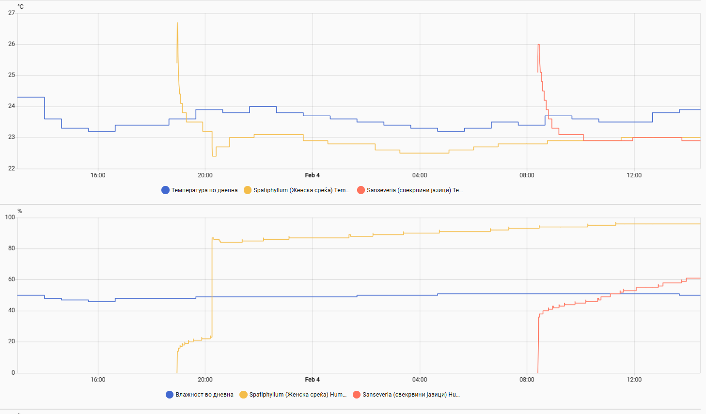 I placed two of them in some indoor flowerpots and started monitoring. The temperature sensor is supposed to measure ambient temperature and they look OK. The humidity sensor is supposed to measure soil humidity, and it is behaving weird. The spike on the yellow line is me watering the plants. The red sensor was placed the following morning, but both pots were watered at the same time. It doesnât seem right to me that the soil is still saturated with water even after all those hours. Furthermore, it is constantly rising. Something is very odd here.