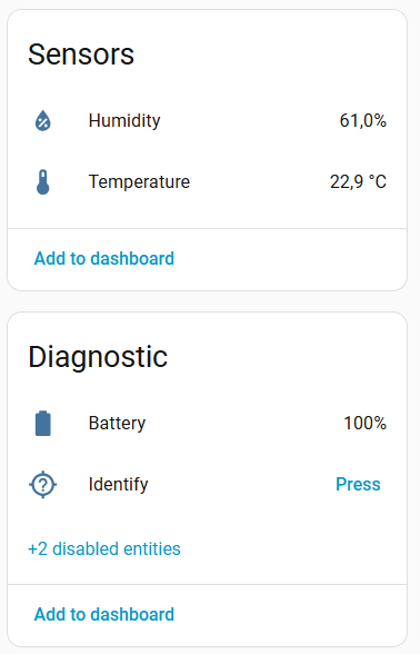 Devices paired successfully with ZHA and exposed two sensors, humidity and temperature, as well as battery.