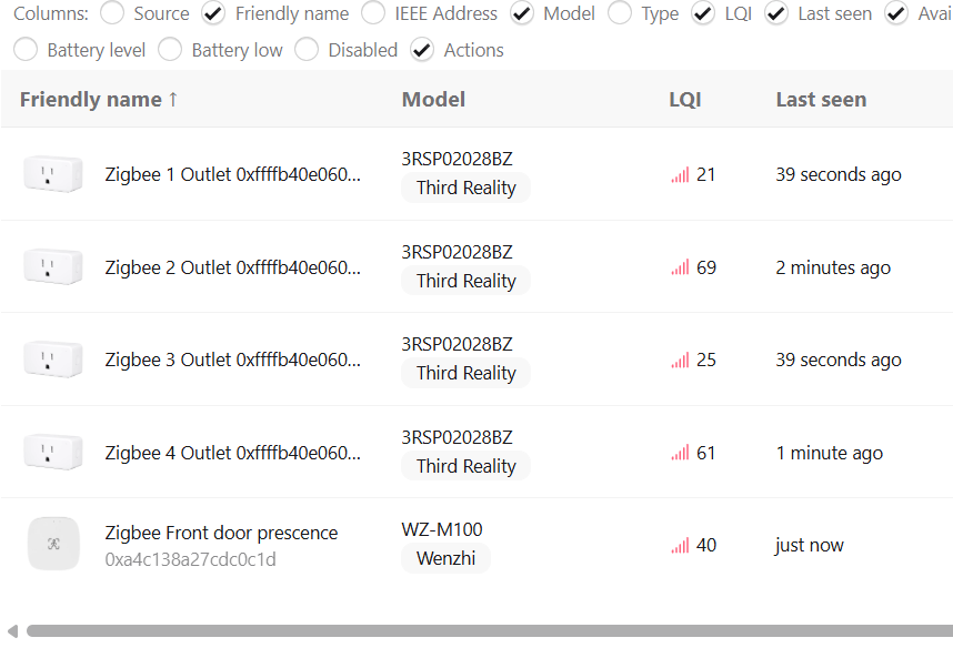 According to google, I shold be getting an LQI of near 200. I thought maybe 4 outlets/repeaters was not enough, but the dongle is now too close for that to matter. All of the outlets (4 total) are mains powered. The presence sensor is powered by USB adapter so may not repeat.