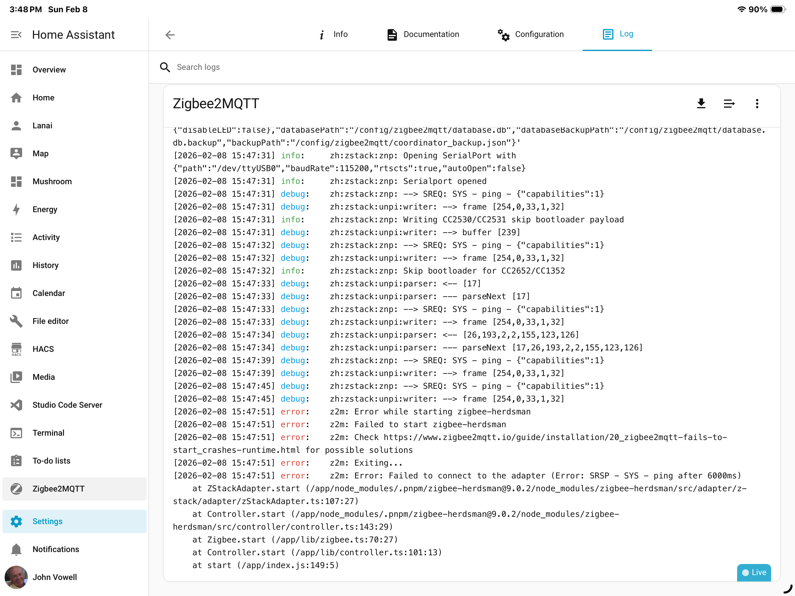 I am using a Sonoff Zigbee 3.0 dongle on a Dell Optipex computer. Zigbee2MQTT has failed to start and as a result, all my Zigbee devices are now unavailable.