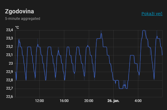 Note that drop below 22.8 is the result of lower night temperature in the stove, so radiator temperature actually doesn’t reach needed temp. to successfully heat up to 23 degrees.