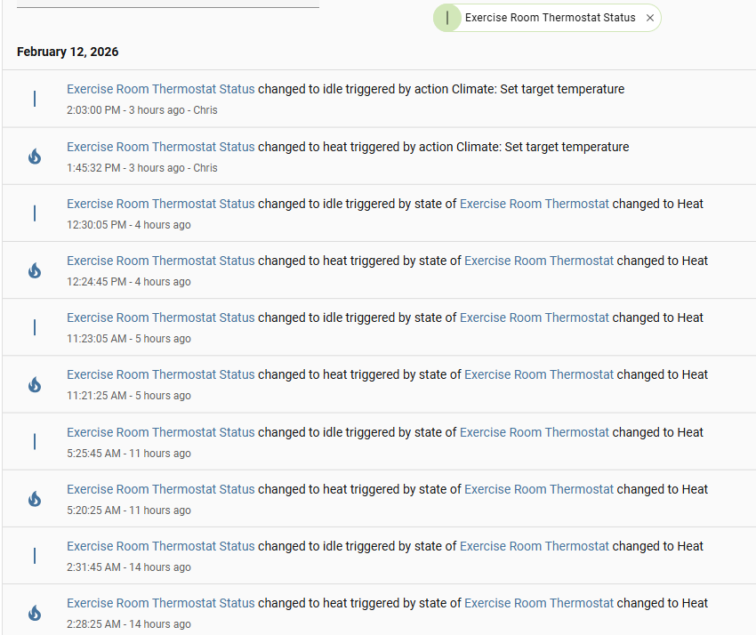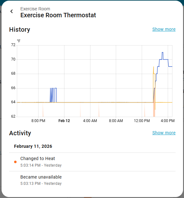 But it sort of half works. All the dashboards are wrong but when I look into the stats history that’s correct. Also, if I change the thermostat temp it doesn’t show on the thermostat card but it does actually make the change at the thermostat (and the stats history shows it). If I look at the Activity pane for the thermostat ZWave device in ZWave, there are no new entries showing up. If I go to the overall Activities (formerly Log) and filter by the thermostat I see all the times the thermostat turned the heat on and off over the last day.