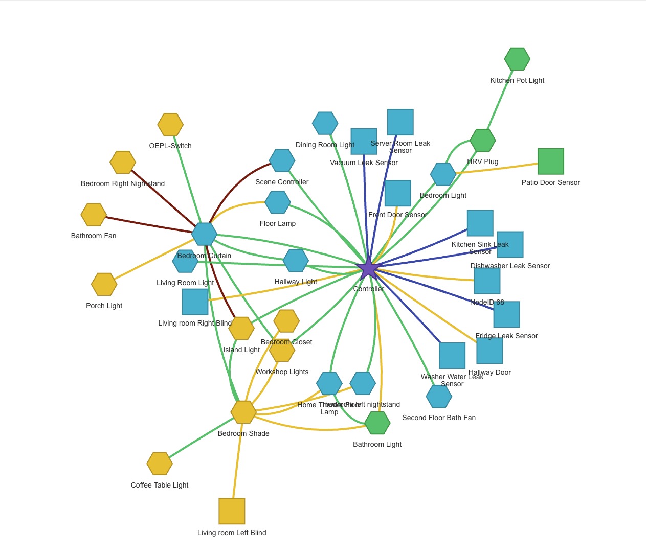 It does not look really bad, but it’s far away from perfect. You have some single points of failiure(Bedroom Shade and Curtain), some slow routes and routes with unnecessary hops. Let me guess, eg. Porch Light is delayed.